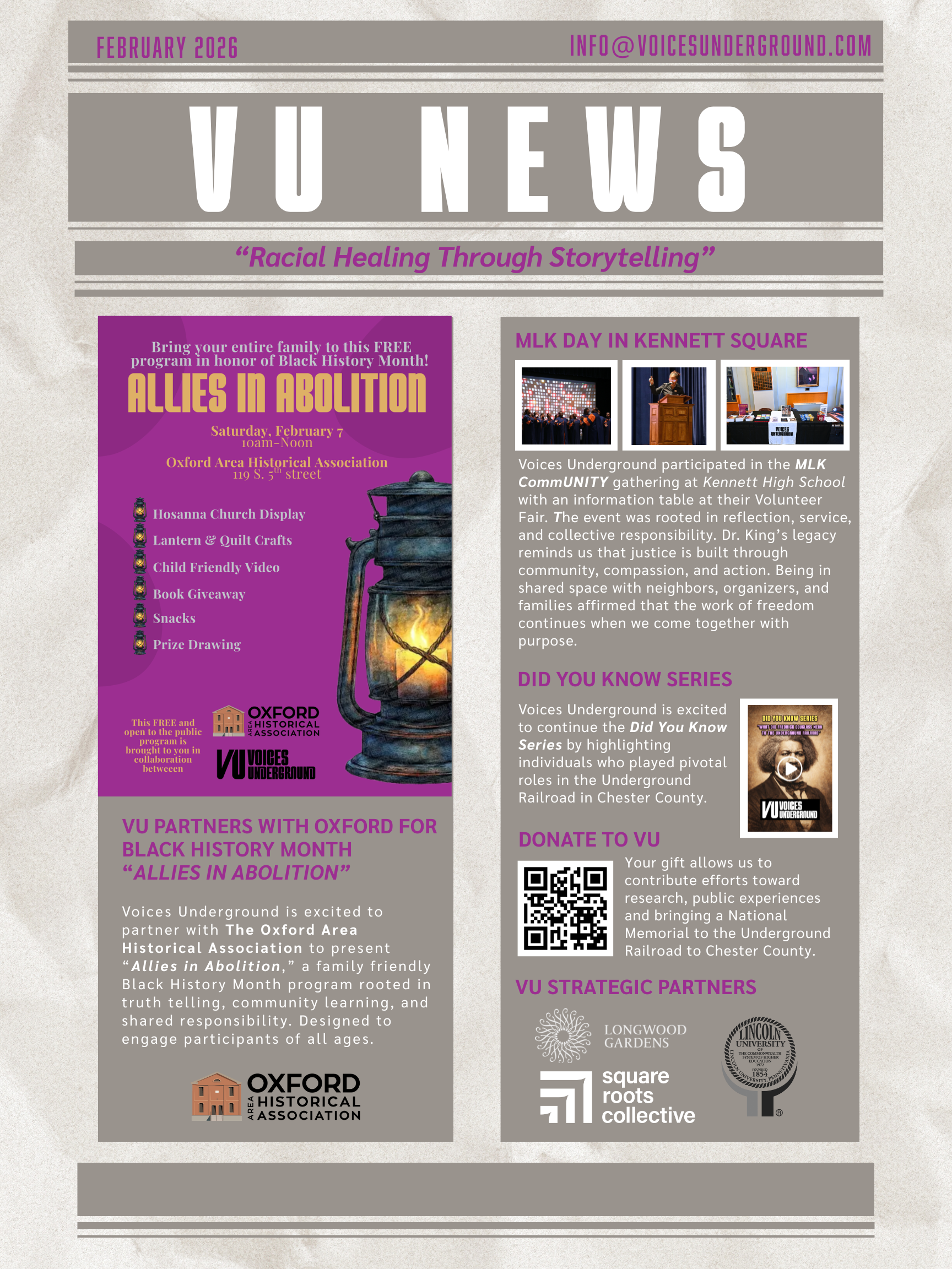 Voices Underground has been featured in publications including West Chester Neighbors and the Chester County Press, reflecting our growing impact and commitment to community-centered storytelling. By making the past accessible and relevant, we invite audiences to engage with history as a living legacy that continues to shape our collective future.